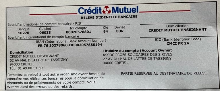 Si vous rencontrez une difficulté pour donner via le biais de la plateforme Helloasso, nous mettons à votre disposition le RIB de l’association pour procéder à un versement bancaire.